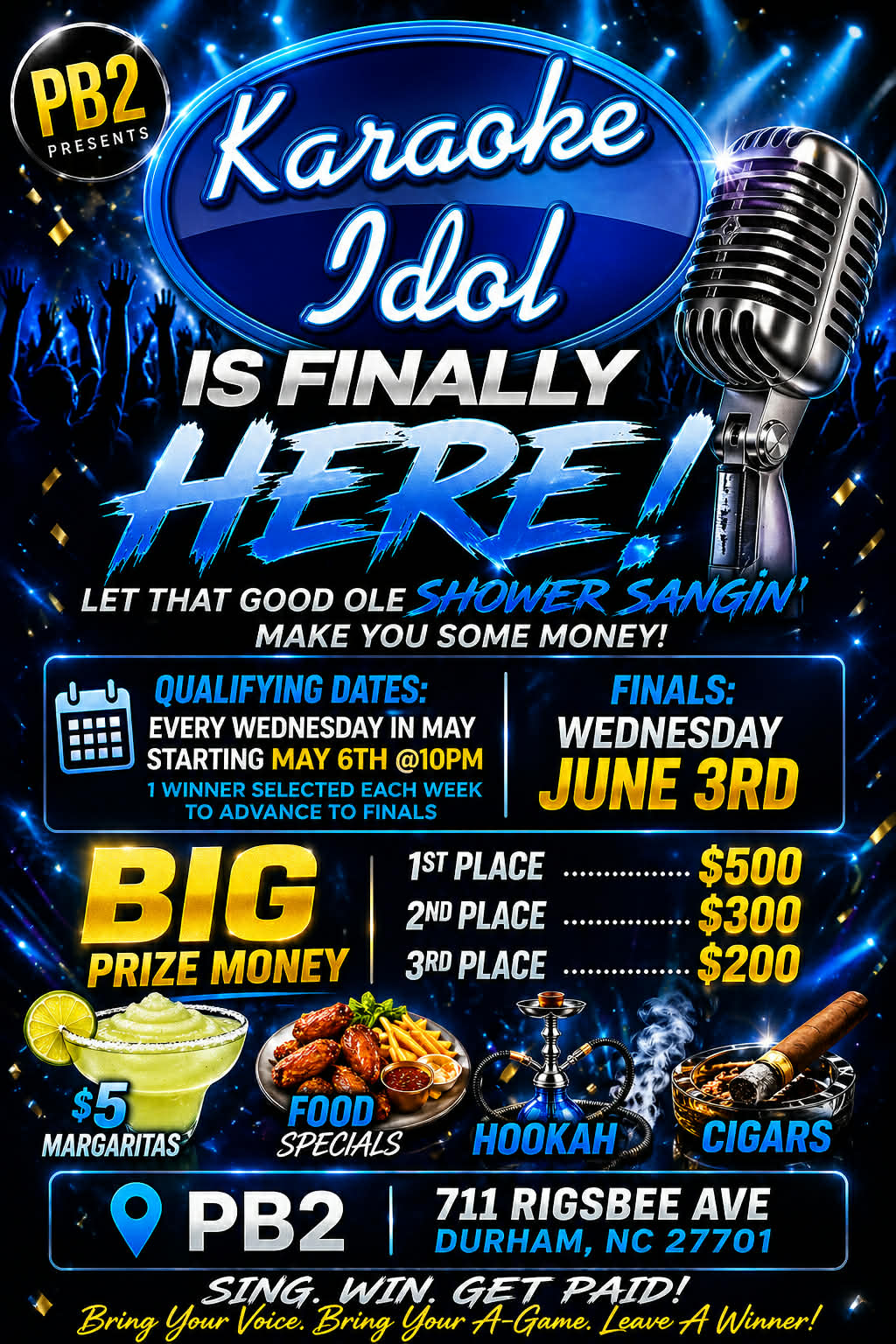 Karaoke IdolBy Pickleback2 / 29 April 2026 Karaoke Idol 932 932 people viewed this event. Register for event Date And Time 05-06-26 @ 09:00 PM to 05-07-26 @ 01:00 AM Location - Share With Friends Facebook Twitter Linkedin Xing Pinterest