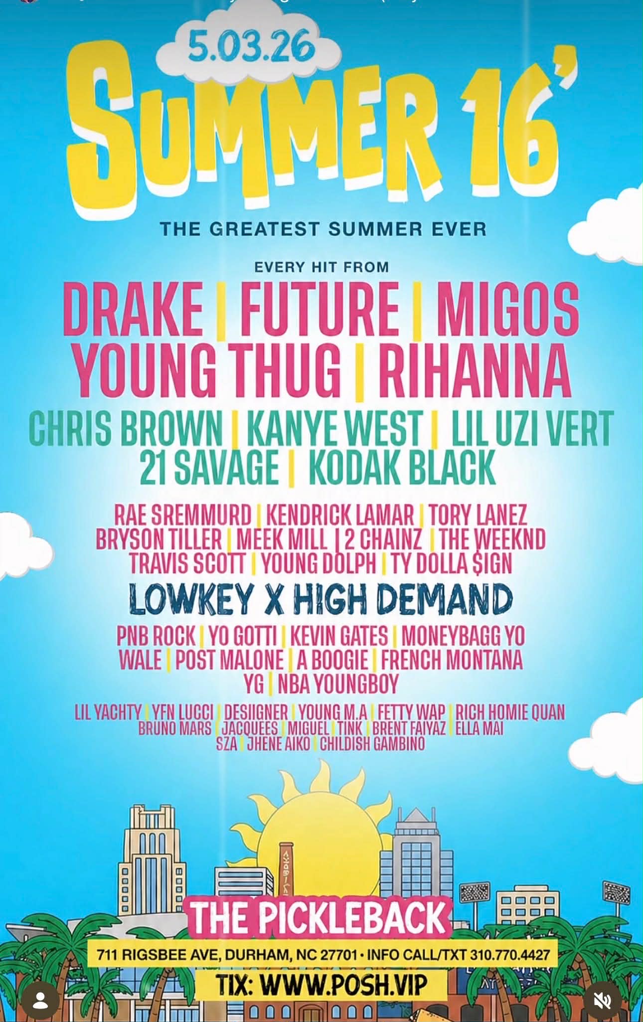 Summer 16′By Pickleback2 / 29 April 2026 Summer 16′ 1531 1531 people viewed this event. Register for event To register for this event please visit the following URL: http://MyTicketsLive.net → Date And Time 05-03-26 @ 04:00 PM to 05-03-26 @ 09:00 PM Location 711 Rigsbee Ave Share With Friends Facebook Twitter Linkedin Xing Pinterest